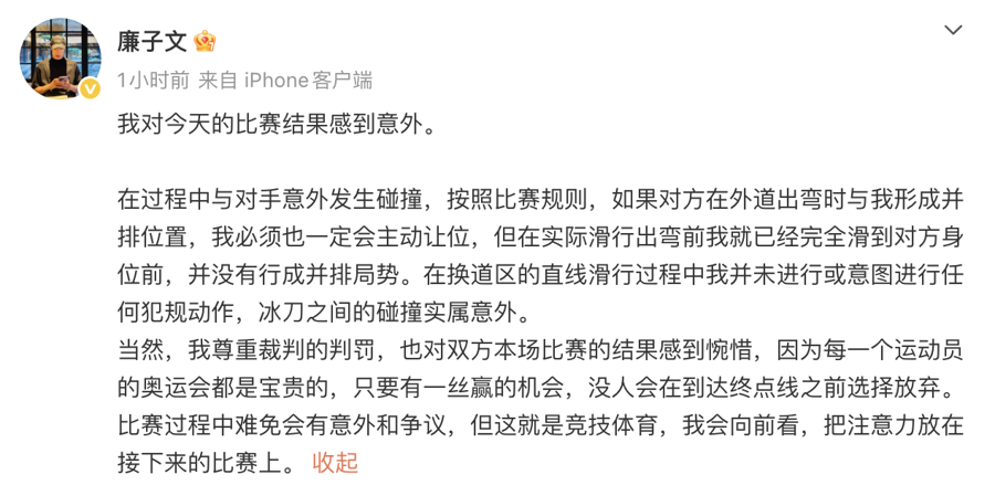 在2月12日凌晨举行的速率溜冰须眉1000米比赛中,第11组出场的廉子文与荷兰名将约普·文内马斯换说念时发生碰撞,被取消收获。
